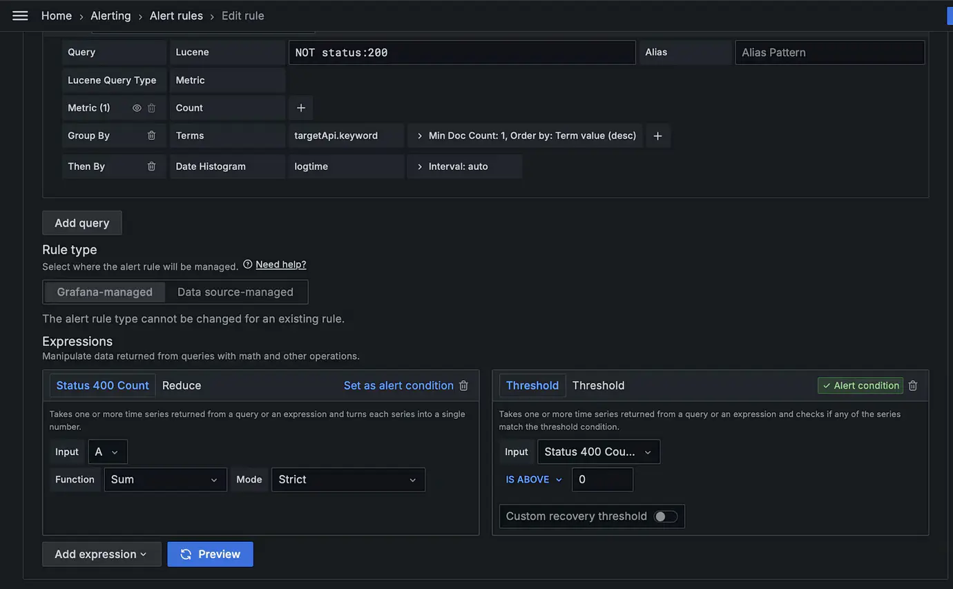 A major challenge we faced was that Grafana alerts typically rely on numeric data, while we were using JSON log data. To address this, we created a Lucene query that matched our alert conditions and organized the data by metric and timestamp. This transformed the log data into a time series format, enabling precise alerts. After setup, the alert system worked effectively, allowing us to quickly identify and resolve issues.
