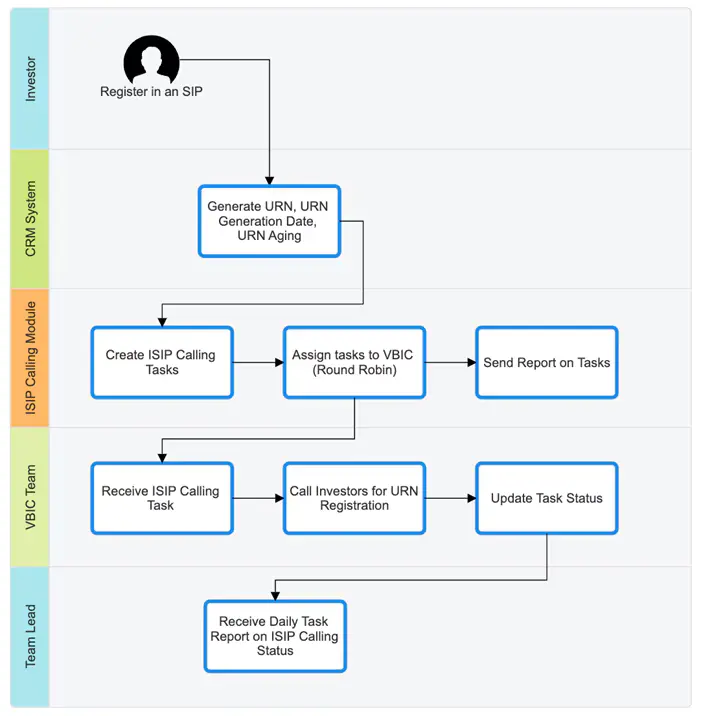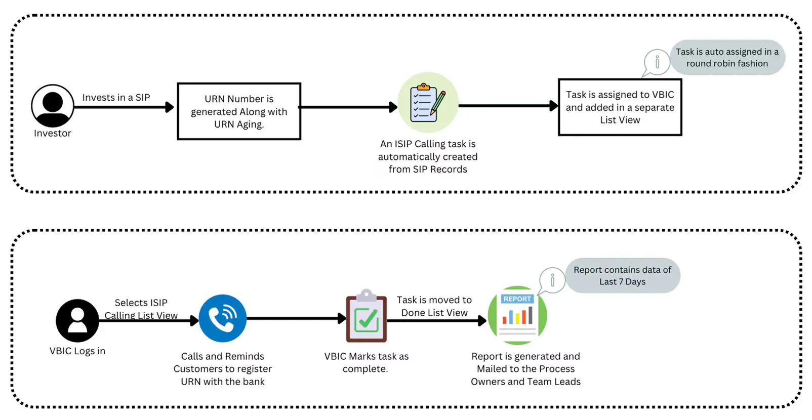 Once an Investor invests in an SIP, a URN number is generated. A task is also automatically created for each registered SIP. A critical point regarding the assignment of this task was to ensure that the tasks are divided properly among the VBICs, ensuring effective work management. This was achieved by automating the task assignment process to assign tasks in a Round Robin fashion. This logic takes care of the proper assignment of tasks. Once the task is assigned to a VBIC (Virtual BIC), the VBIC is responsible for calling investors and reminding them to register their URN details. A report of all pending and completed ‘ISIP Calling’ tasks is generated daily and emailed to the VBIC Team Leads and Process Owners.